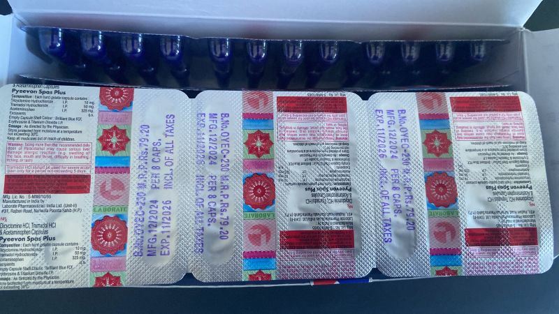 Pyeevon Spas Plus is a combination medicine used to treat severe acute pain, particularly pain associated with abdominal cramps and muscle spasms. It contains a mix of pain-relieving and muscle-relaxing ingredients that work together to provide relief.